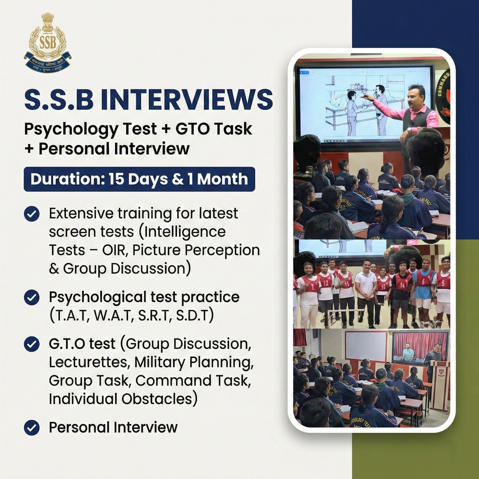 Commandant Academy provides complete and focused training for SSB interviews, including NDA SSB preparation. As a reputed institute, we support candidates with effective strategies and personalized mentorship to achieve the best possible results.